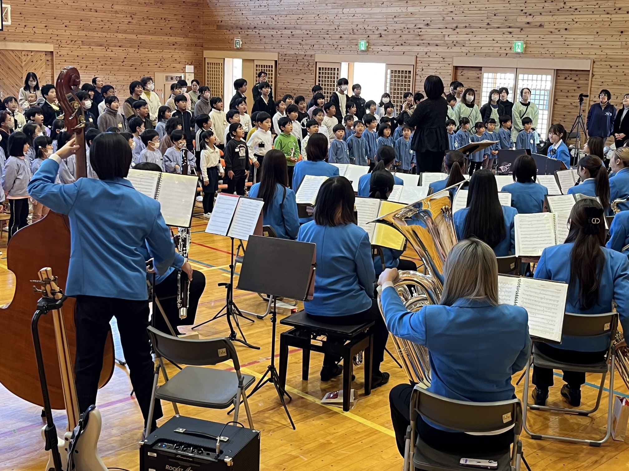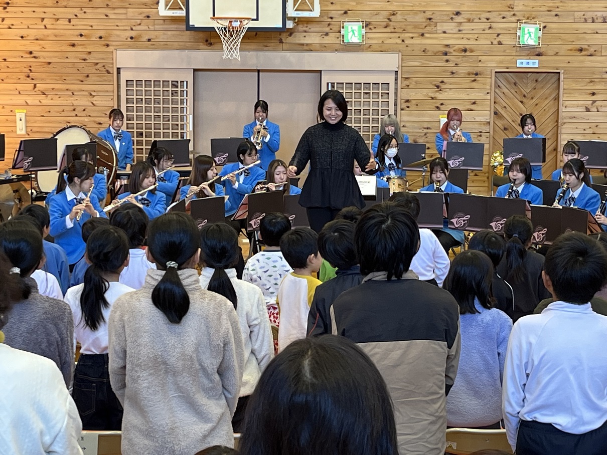 演奏を届けてくださったのは、大垣女子短期大学音楽科「ウィンドアンサンブル」の学生の皆さん。おなじみのクリスマスソングやミッキーマウスマーチ、となりのトトロの曲など、心躍るメロディが体育館いっぱいに響き渡り、子どもたちも大人の皆さんも自然と笑顔に。音楽が持つ力を改めて感じるひとときとなりました。
